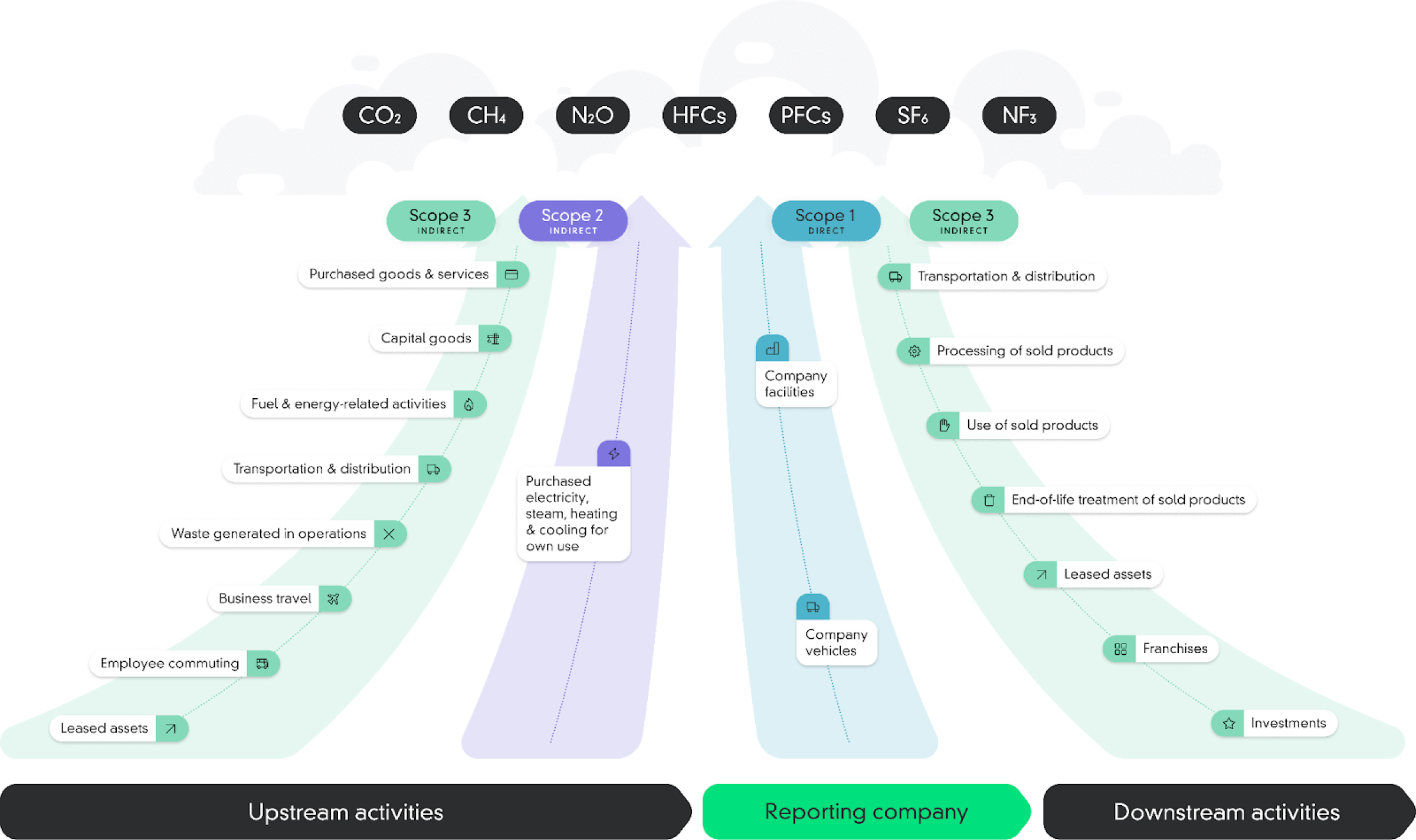 Scope 3 emissions encompass all other indirect emissions that occur throughout a company’s value chain. These emissions are the most challenging to measure and manage due to their indirect nature and broad scope. There are 15 categories of Scope 3 emissions, including: